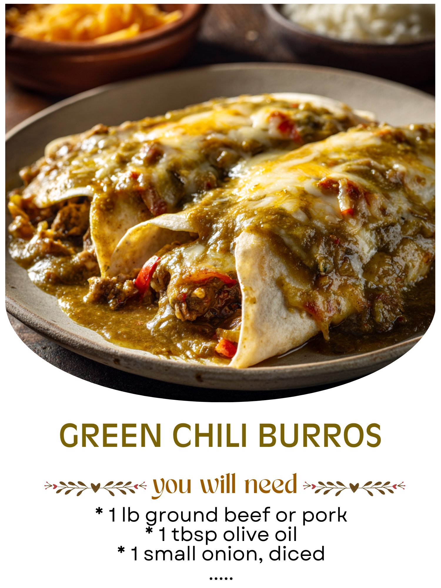 Warm, cheesy burros stuffed with seasoned meat and smothered in a rich green chile sauce — the ultimate comfort food with a Southwestern kick!